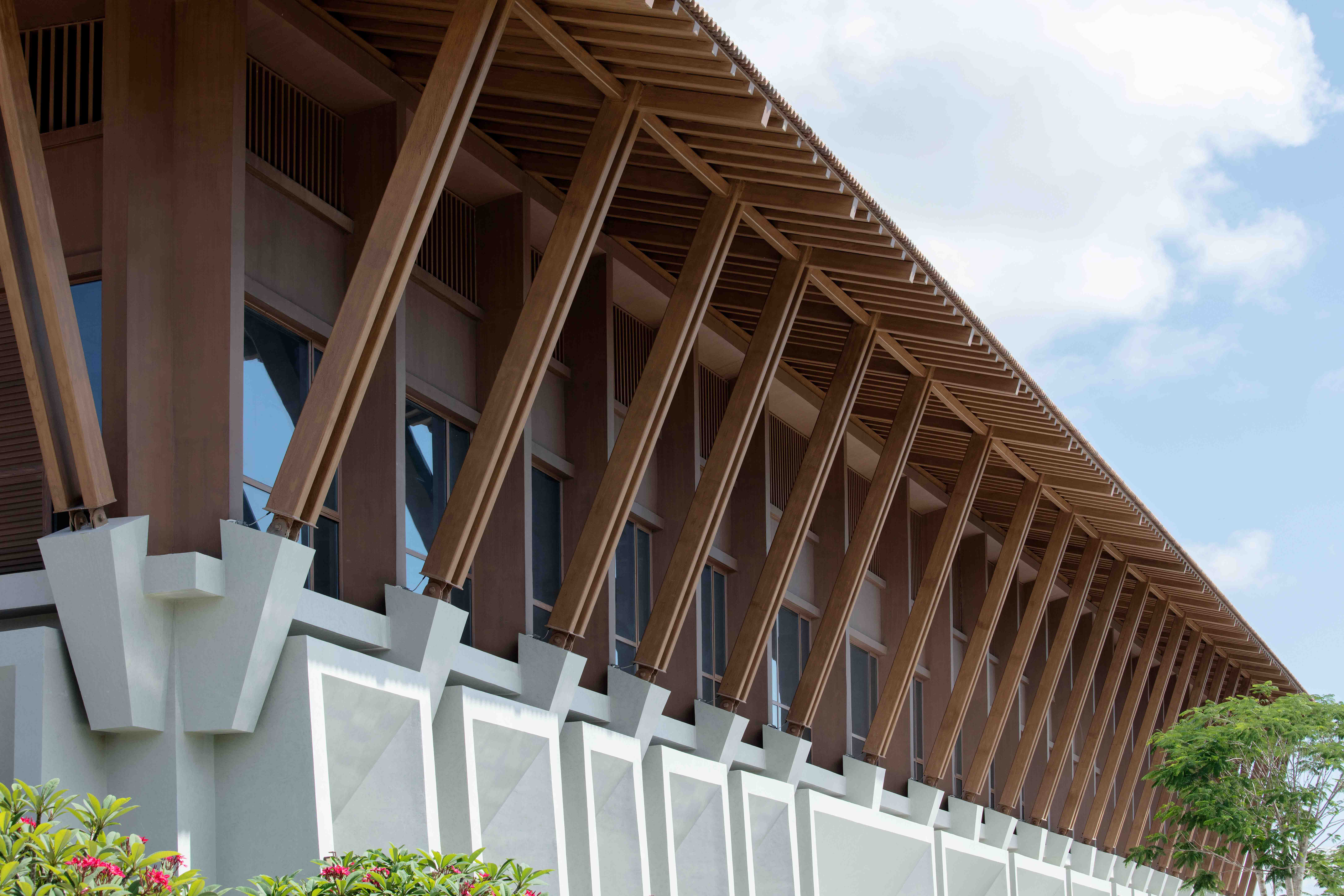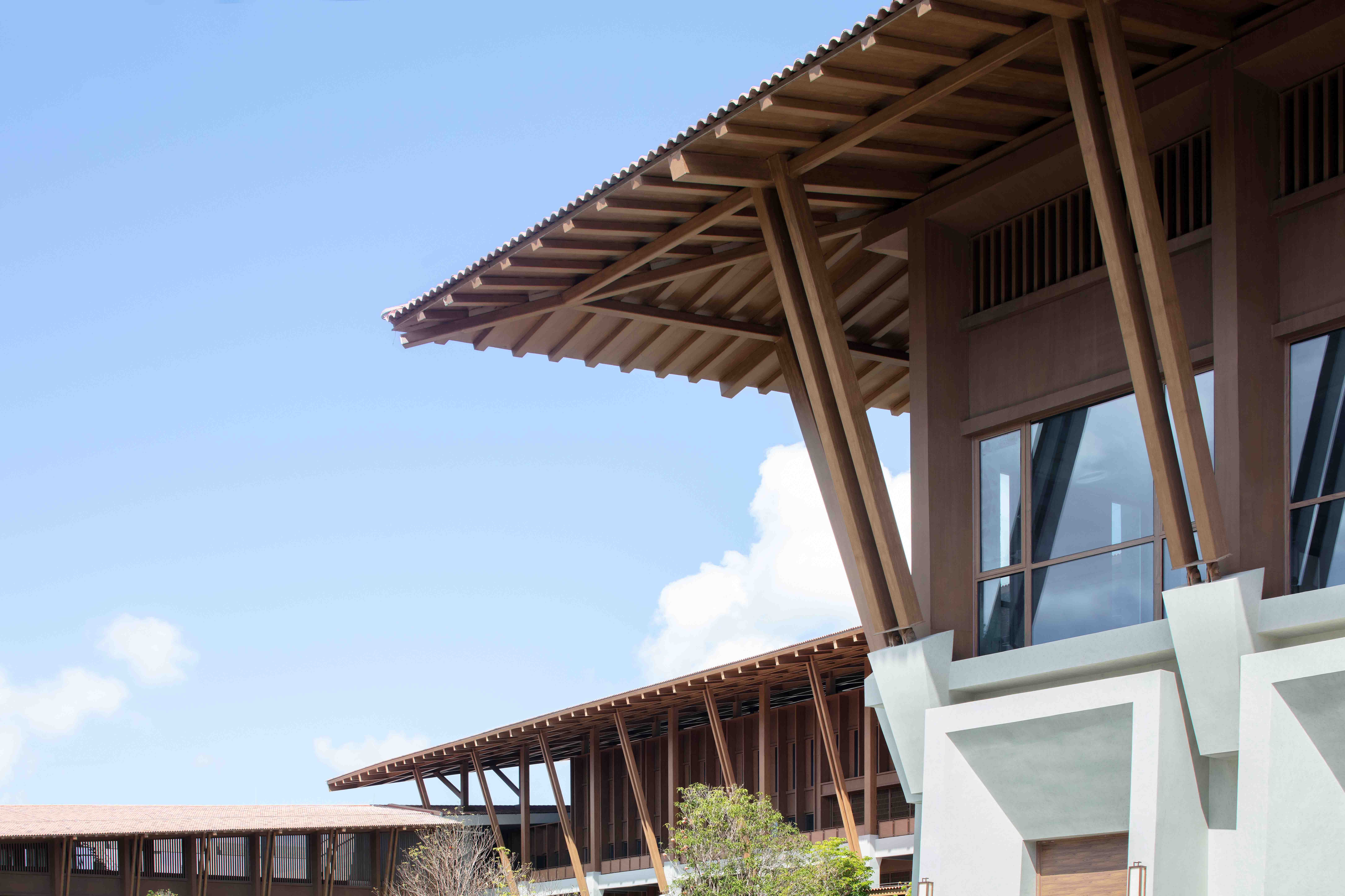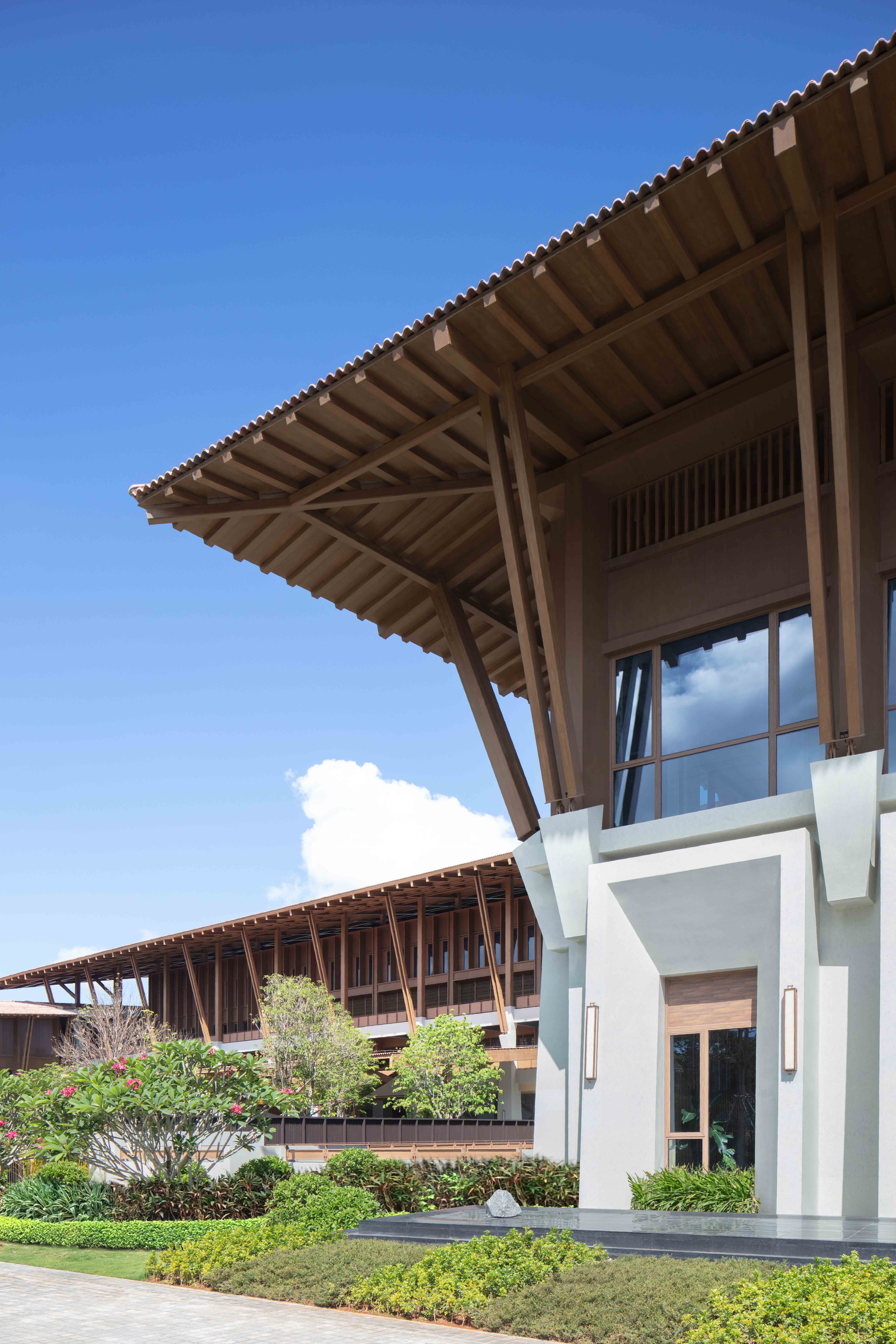 在对当地热带气候条件的回应上,外挑的屋檐满足了基本的遮阳需求,同时在阴影与阳光的对比中形成立面丰富的层次感。深远挑檐下灰空间的设置,更是提供了可应对炎热多雨气候,舒适宜人的活动空间,打造具热带风情的度假氛围。
