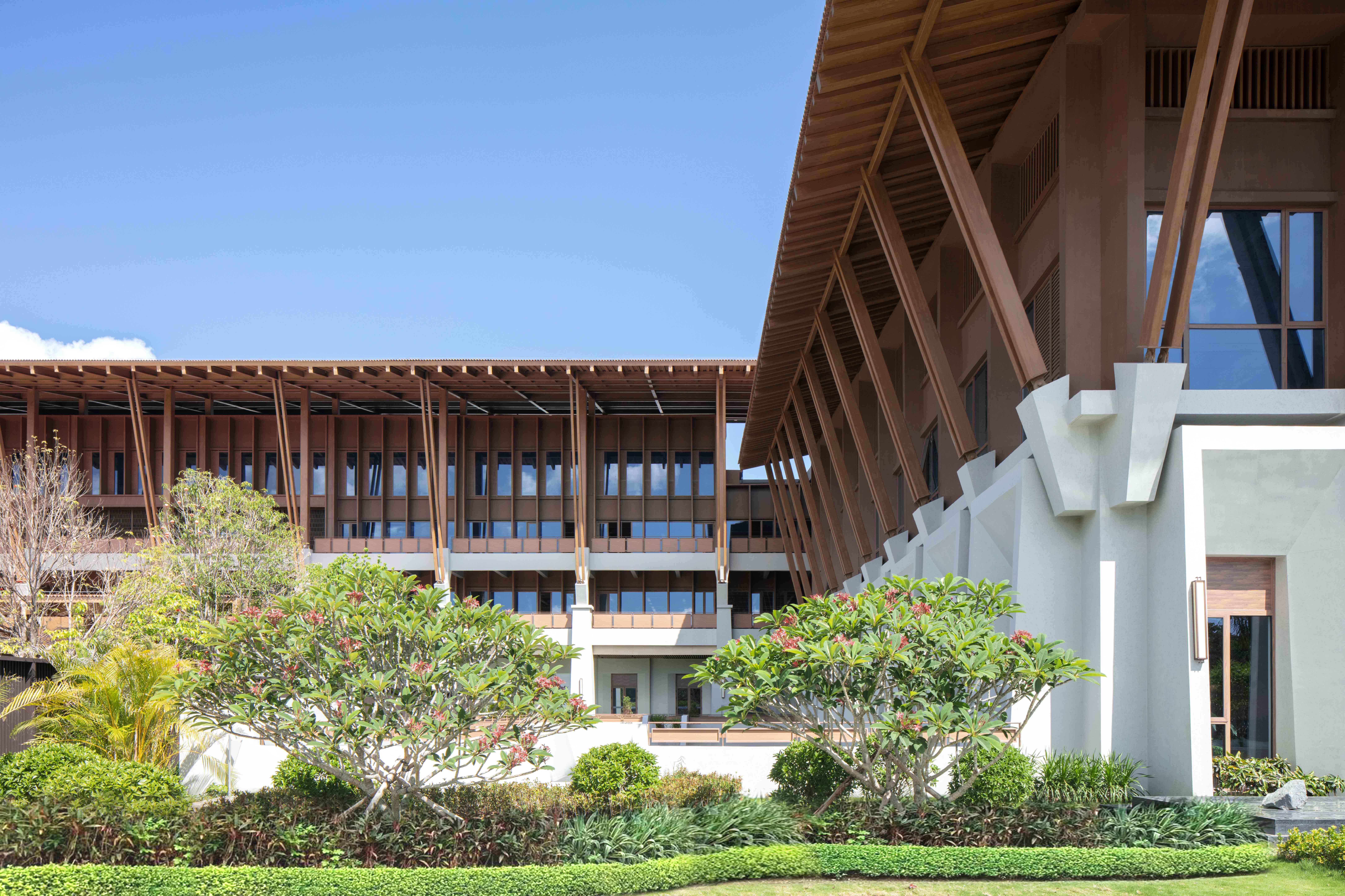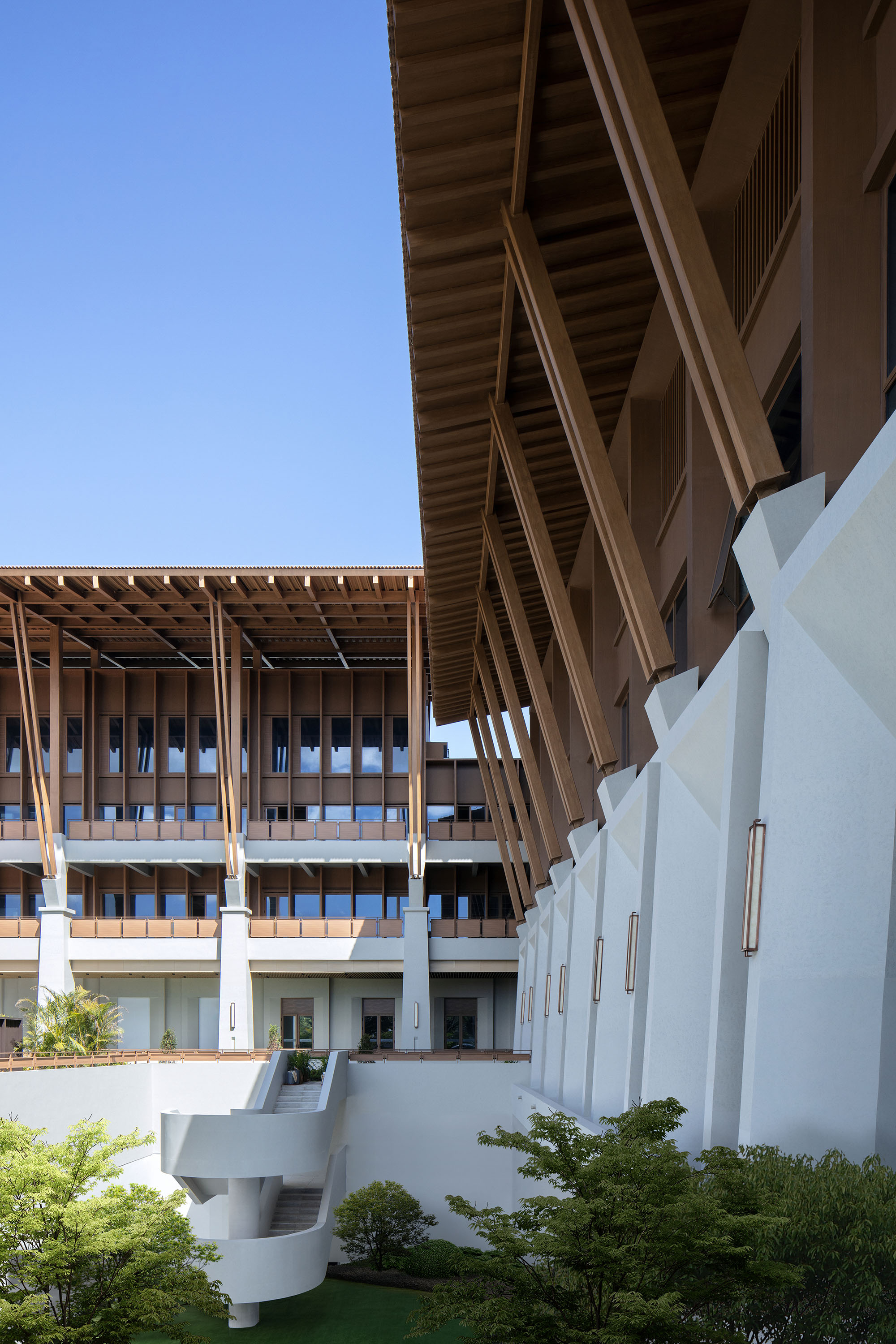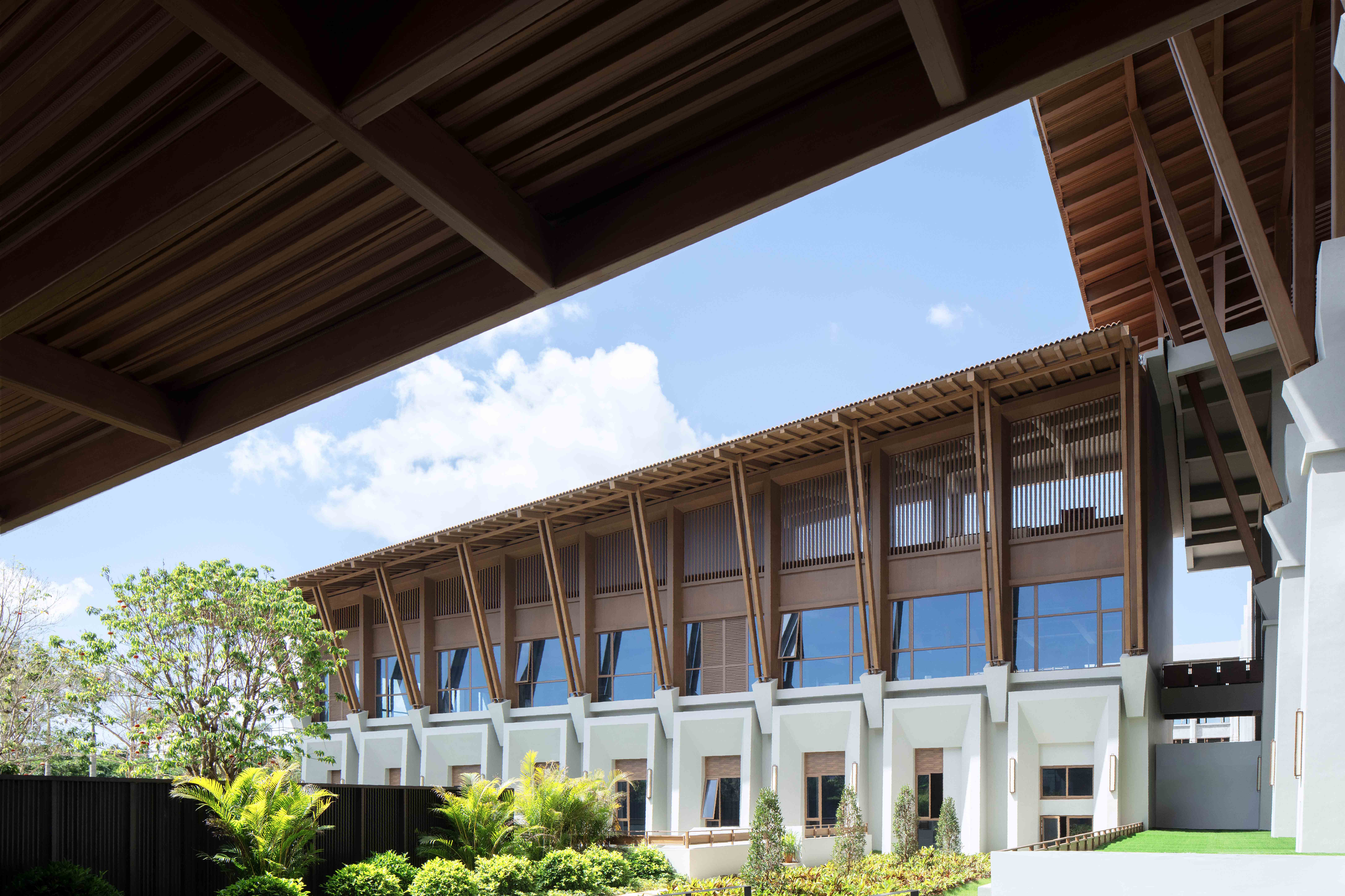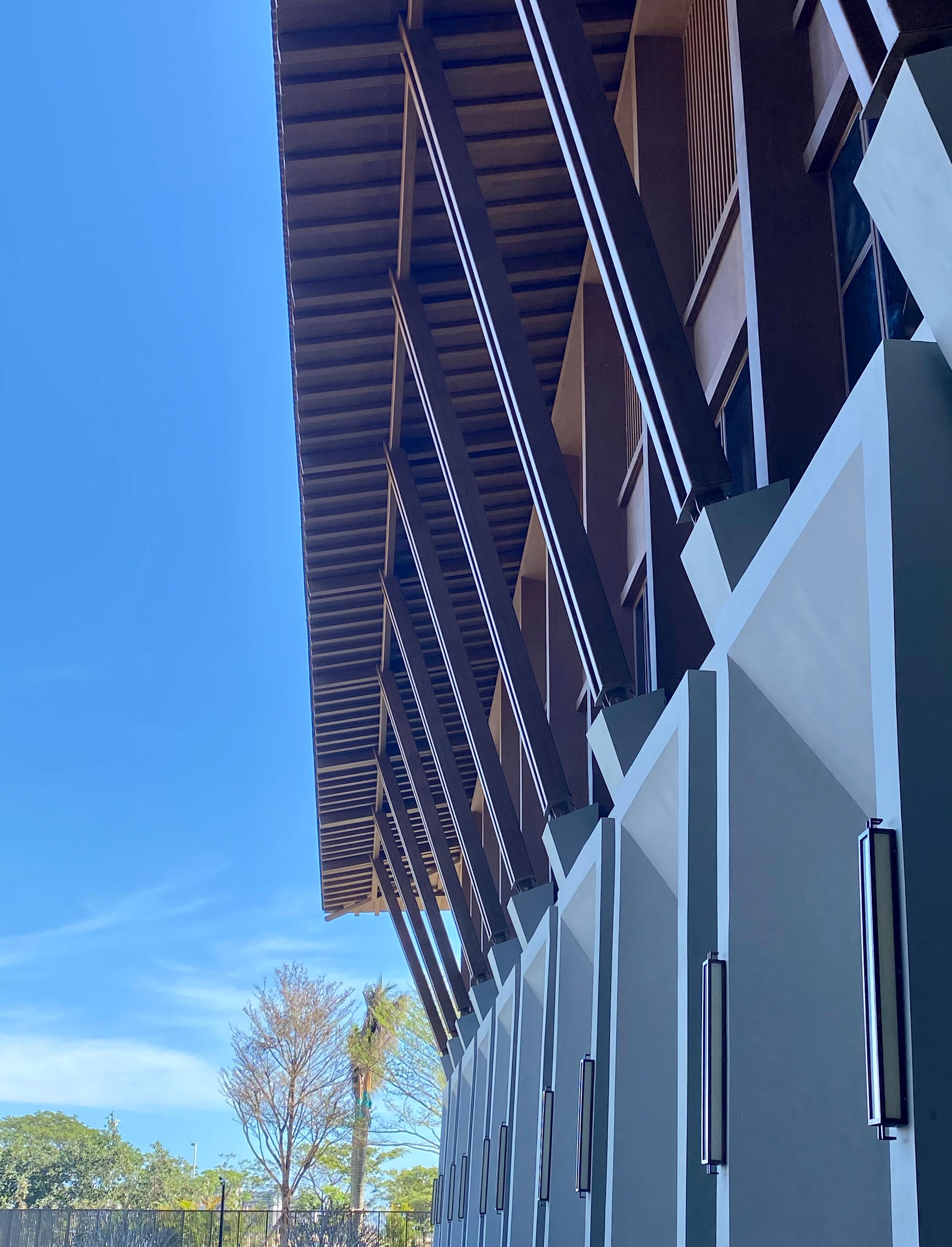 在对当地热带气候条件的回应上,外挑的屋檐满足了基本的遮阳需求,同时在阴影与阳光的对比中形成立面丰富的层次感。深远挑檐下灰空间的设置,更是提供了可应对炎热多雨气候,舒适宜人的活动空间,打造具热带风情的度假氛围。