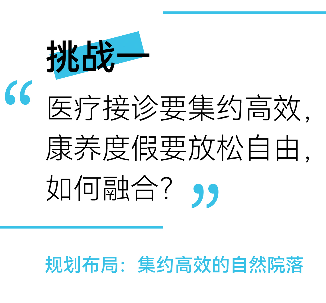 医疗诊治与康养休闲场景在通达效率上呈两极化:医疗接诊通常强调高效与集约,而康养度假寻求自在与闲散,示范中心要辩证地统一“高效而自由”的矛盾。同时,项目总用地面积9.26万㎡,总建筑面积13.6万㎡,建筑密度35%,限高40米,如何在限定的指标内,完成该大体量建筑“就低不就高”的集约化设计,成为规划布局要解决的问题。