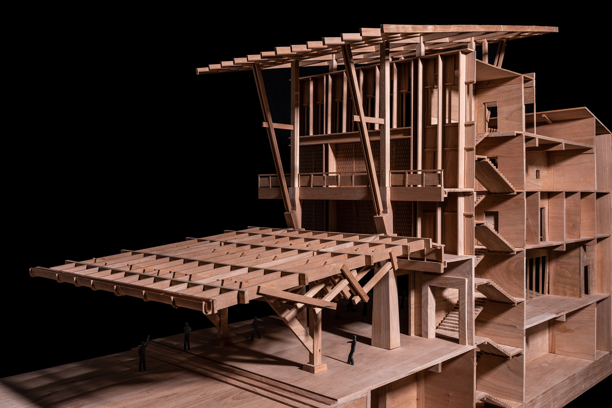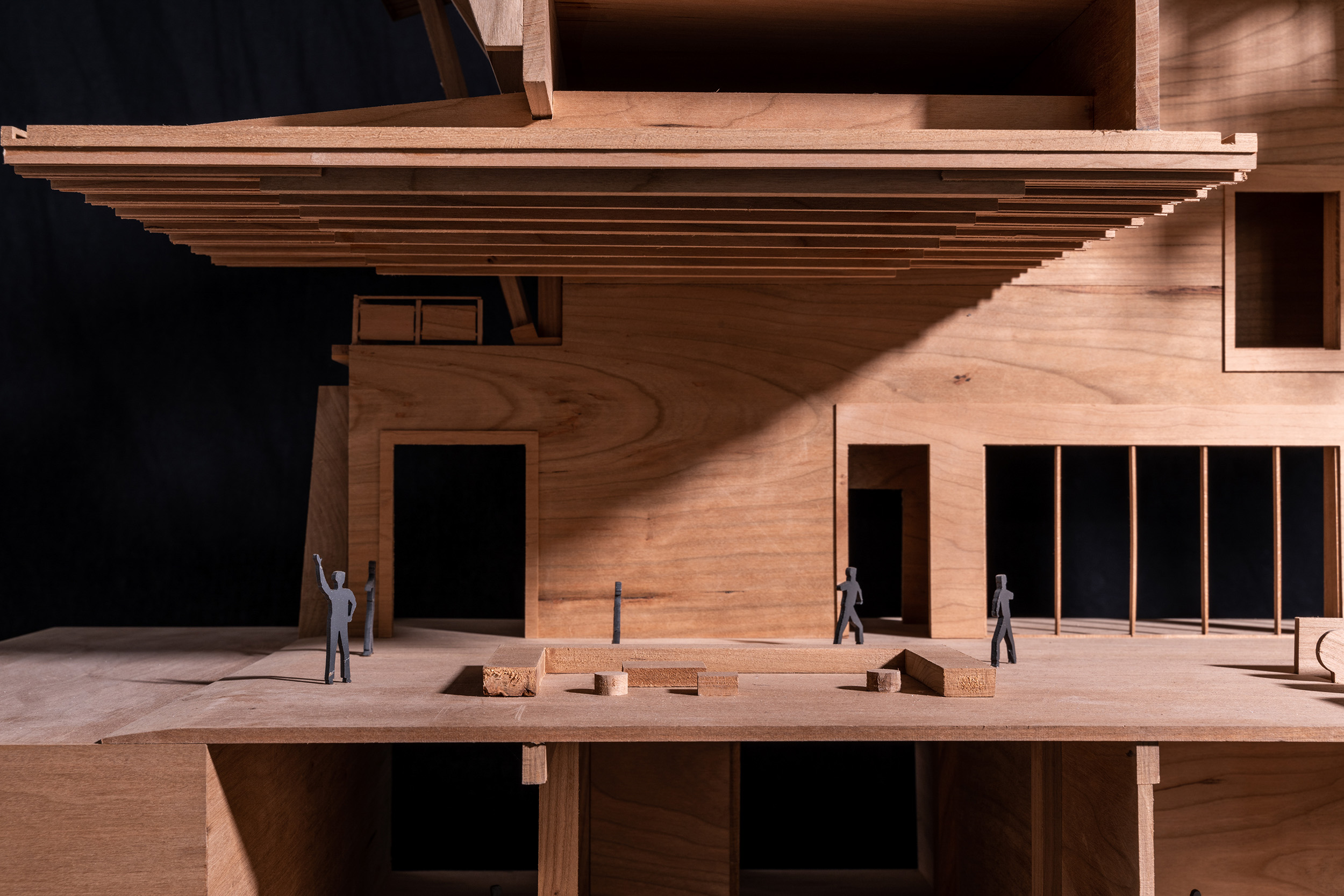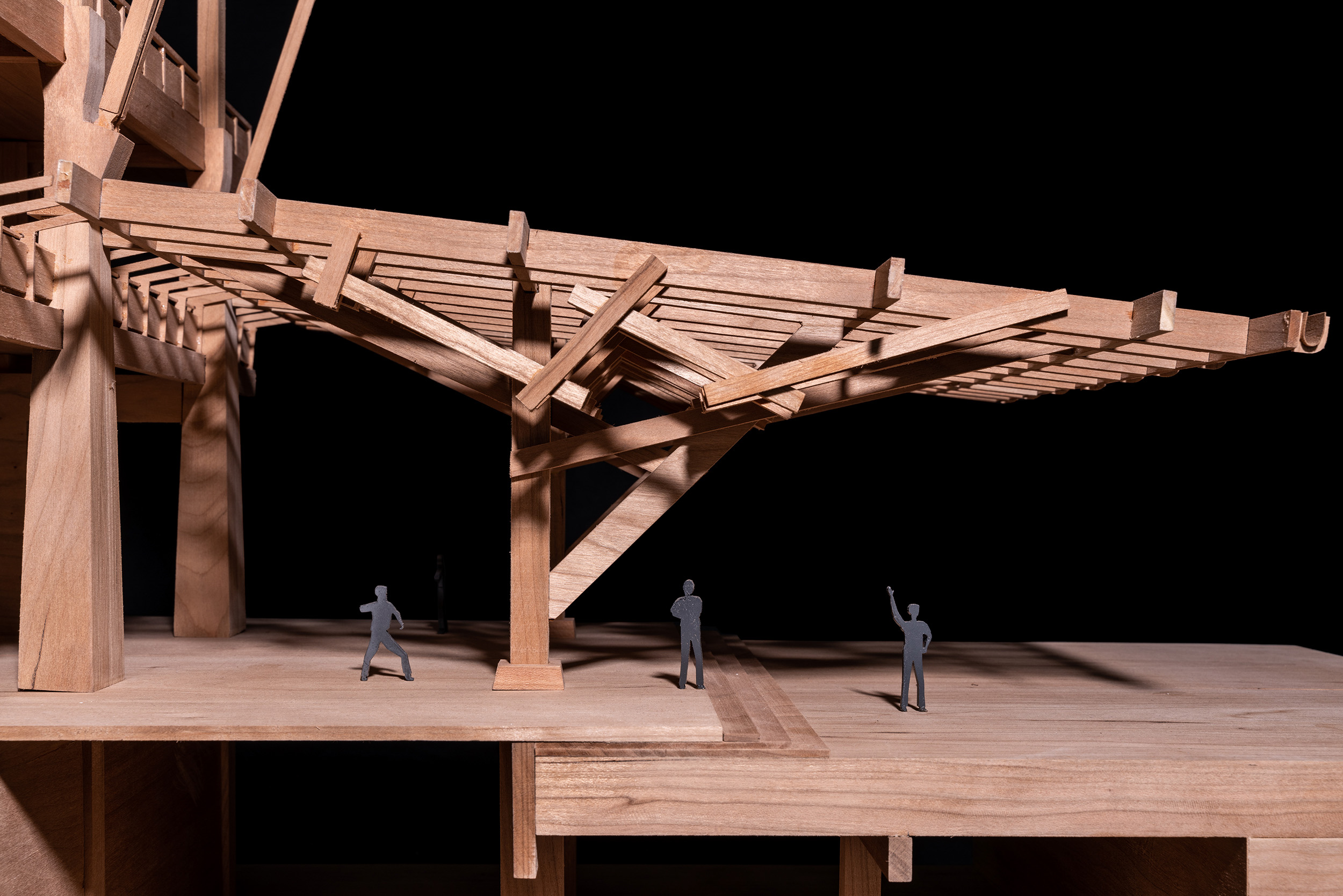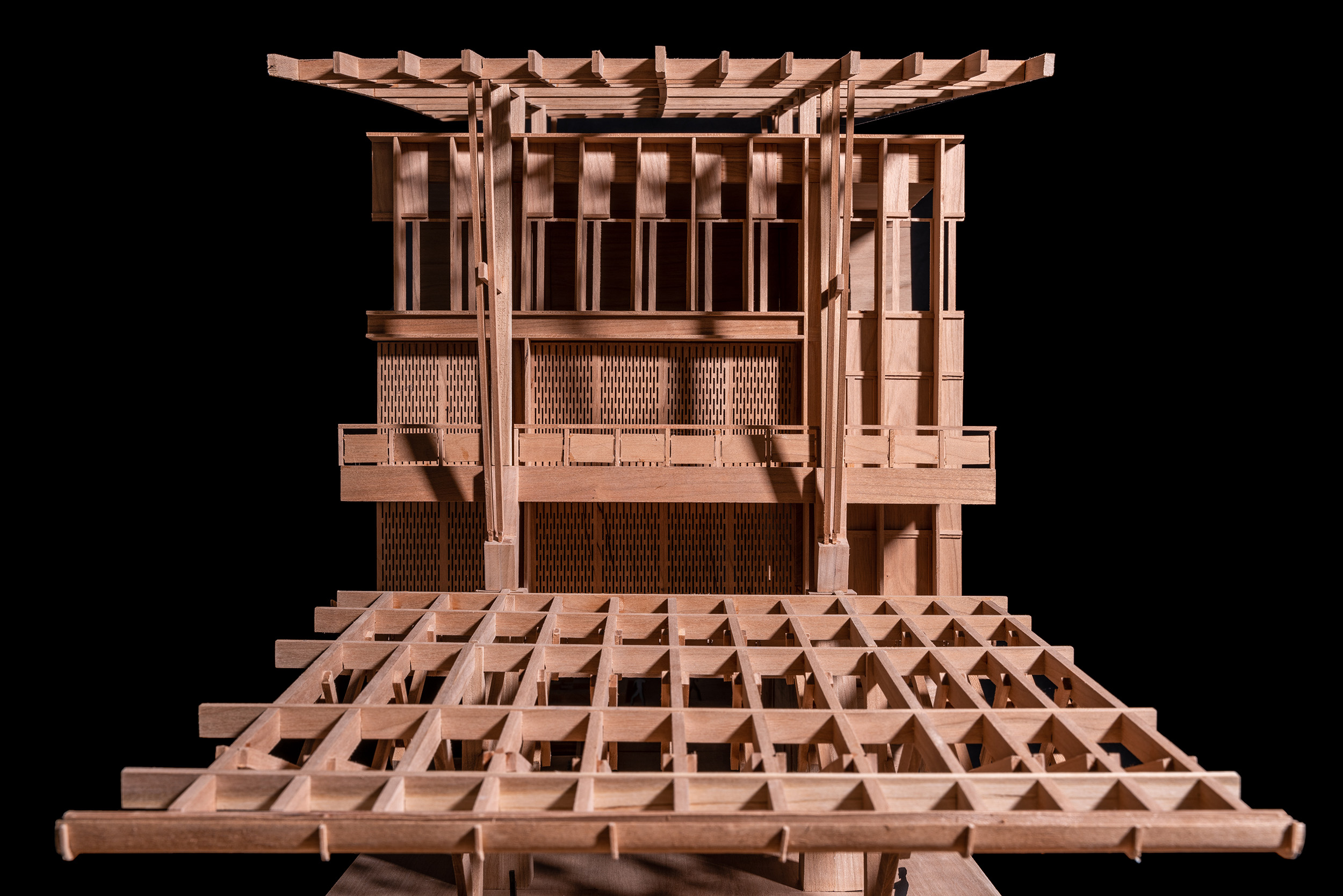 通过模型,我们考究了木结构的檩条、斜撑、窗构件等尺度比例和搭接方式,并转译至立面构造设计中。而成本控制主要体现在材料上:木斜撑与出檐檩条为钢结构覆盖木色油漆,檐垫枋、间柱等框架结构构件采用装饰性砌体,玻璃窗棂与格栅窗采用幕墙铝方通,均覆盖仿木涂料。