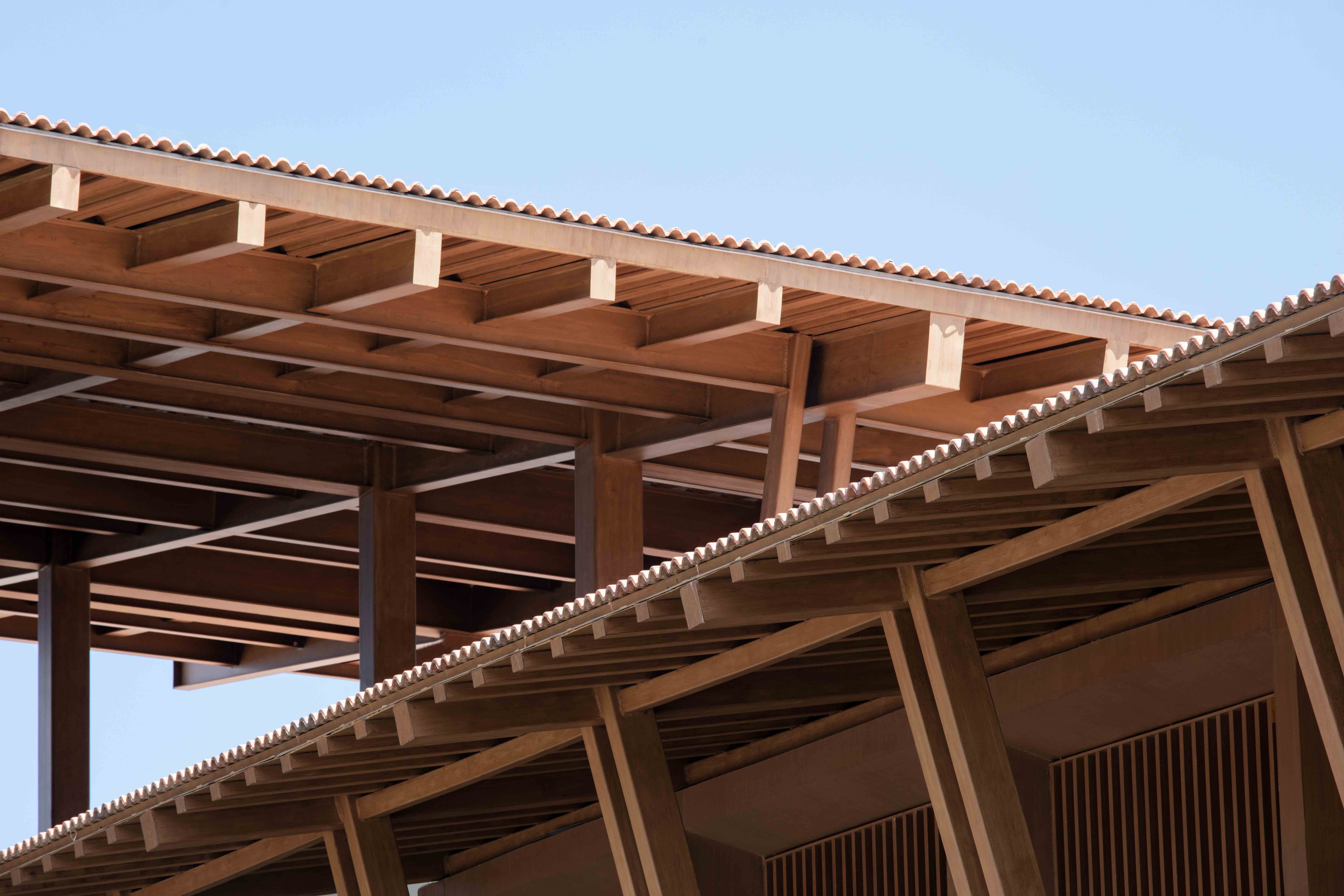红瓦选材上,我们将传统的陶瓦替换为现代混凝土预制瓦,并以6:3:1的面积比例将三种深浅色差的红瓦覆盖屋面,使屋面远观呈现更丰富的颜色层次与更生动的纹理样态。建造施工中,以外沿排水沟为过渡,主体混凝土结构部分采用卧浆覆瓦,出檐钢结构部分采用干挂覆瓦。