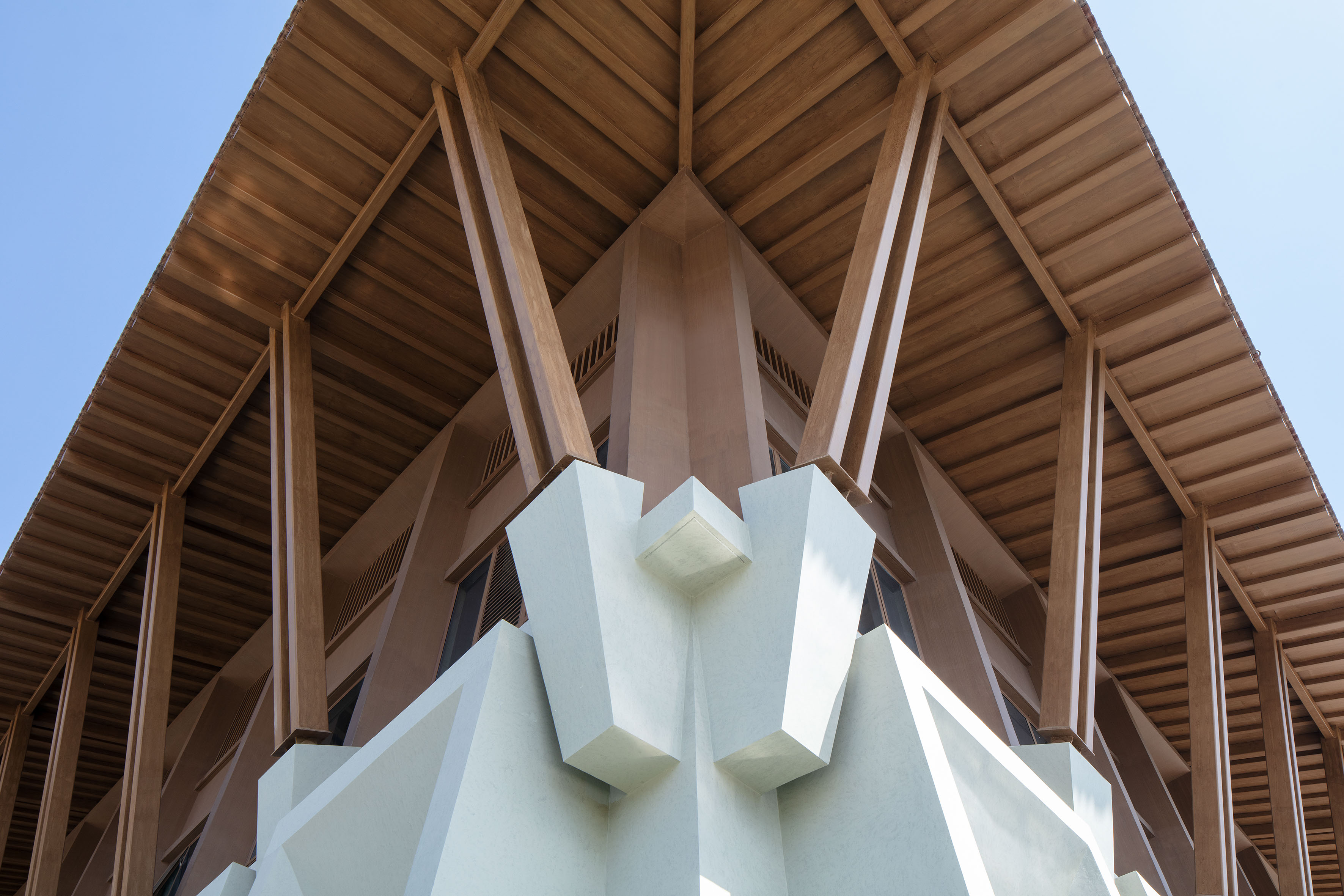 整体立面采用中式建筑的三段式构造:上部屋檐、中部墙身与底部基座。上部近5米的出檐与中段由斜撑、窗构件、框架结构等组成的墙身,若全然采用传统木材料将遇如造价高昂、防火规范严格、防潮防腐等诸多限制,如何复现木结构考究的形制与构造方式,在有限成本内实现现代转译,是立面层次塑造的考量因素。