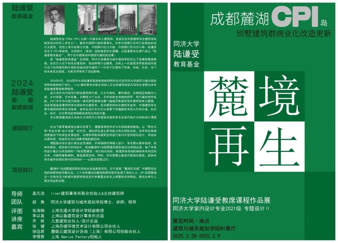 本次同济大学陆谦受客座教席课程作品展,以“麓境再生”为主题,集中展示了学生们对成都麓湖 CPI 岛别墅建筑群商业化改造更新的设计成果。