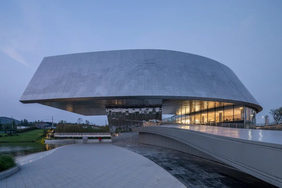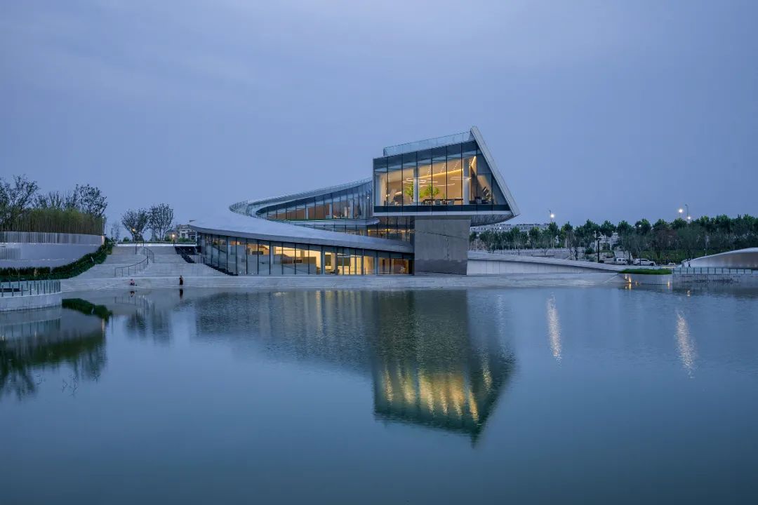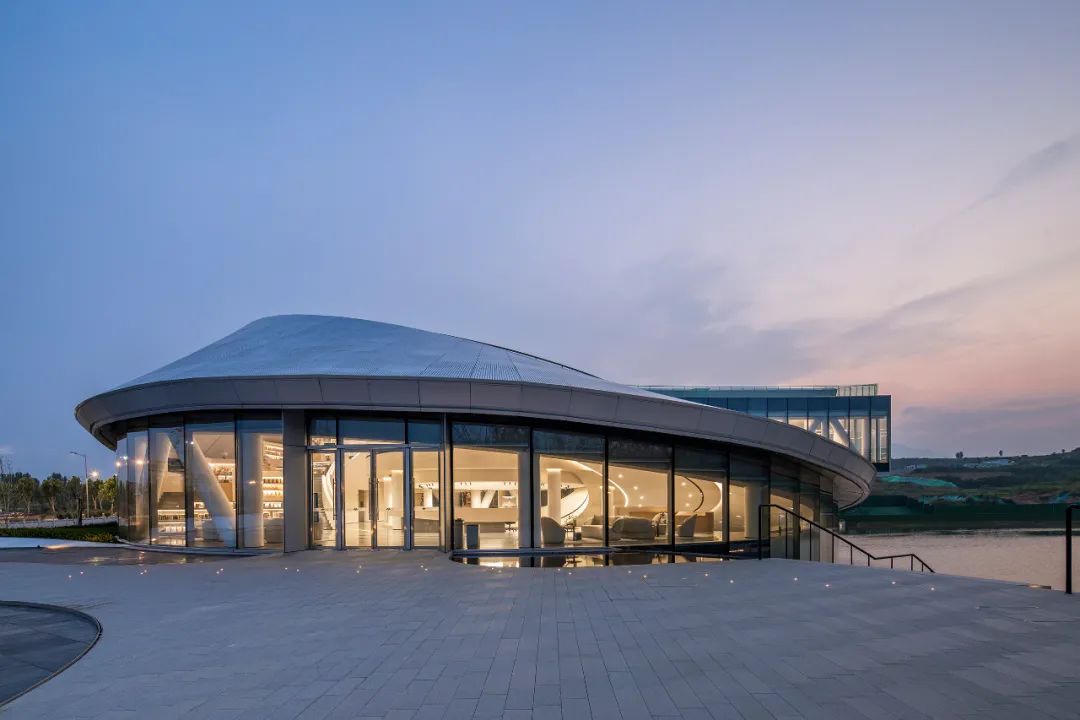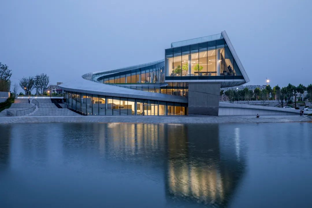 night falls, the silver gray curve of the curtain wall changes subtly with the