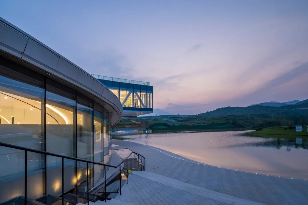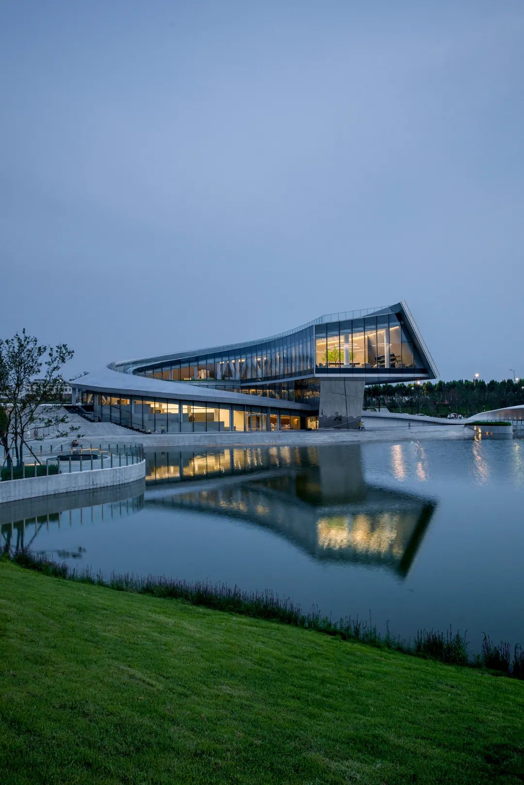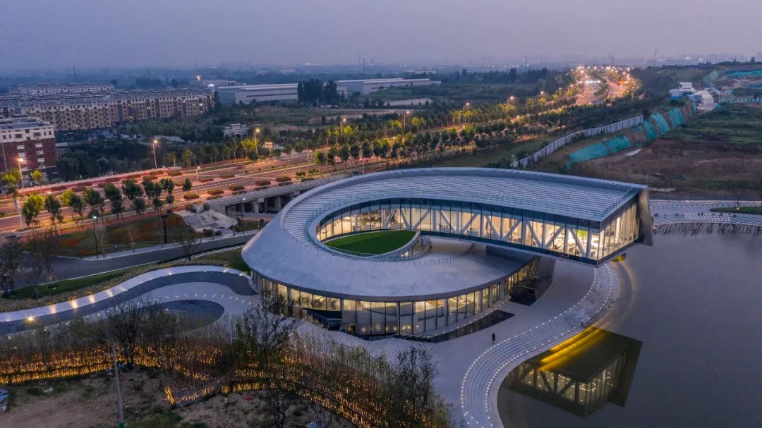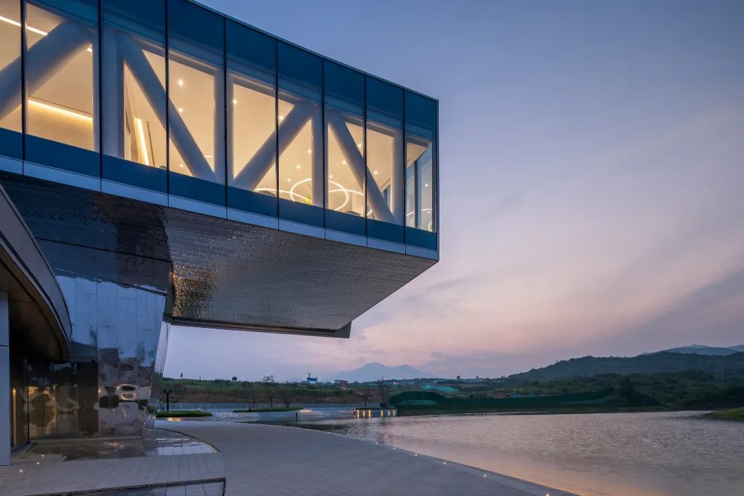 night falls, the silver gray curve of the curtain wall changes subtly with the