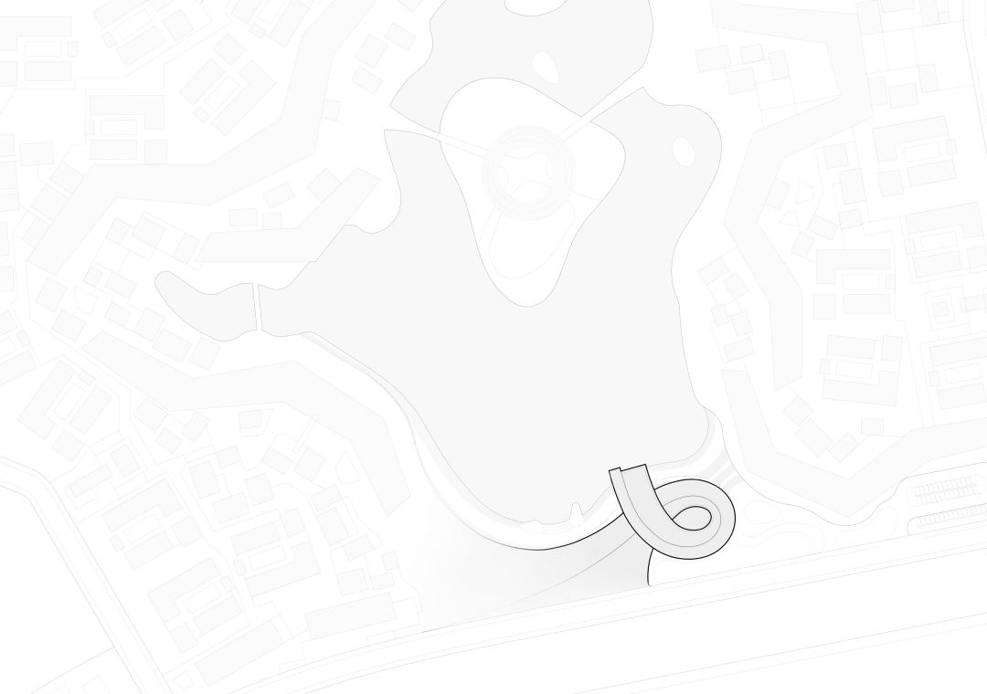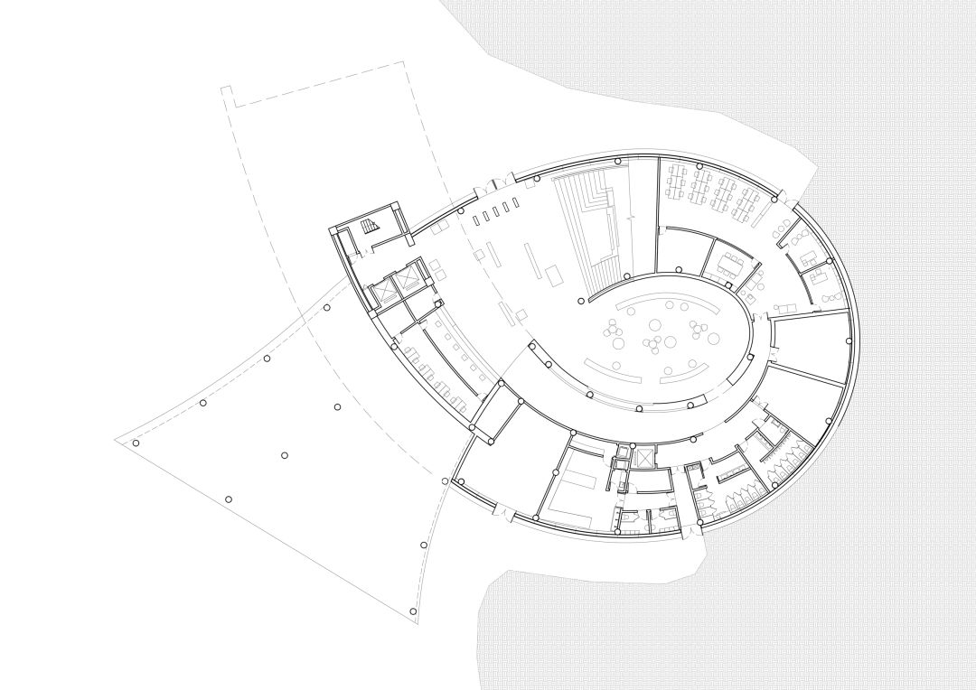 site, extending outward according to the flowing shape of the building, which