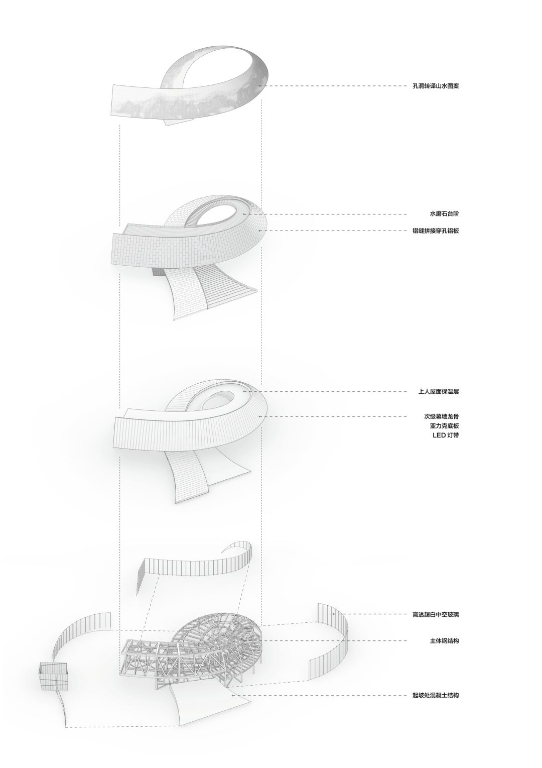supplemented by four layers of hollow ultra-white glass. The outer hyperboloid