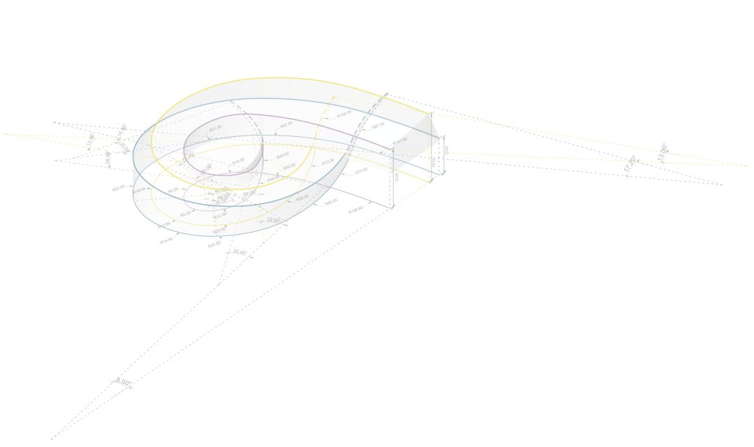 three basic curves controlling the building outline are spliced by several