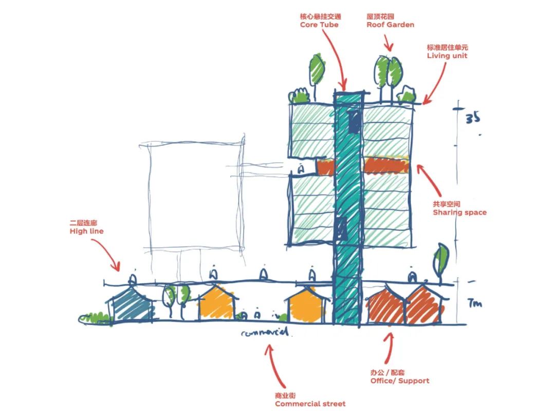 The residential group is based on the premise of reproducible unit grouping to vertically superimpose the residential increments by suspending on the space structure of the ground floor commercial street. The vertical public spaces such as shared space, community facilities, and roof gardens are placed to provide the young residents with a “three-dimensional garden” style neighbourhood communication space.