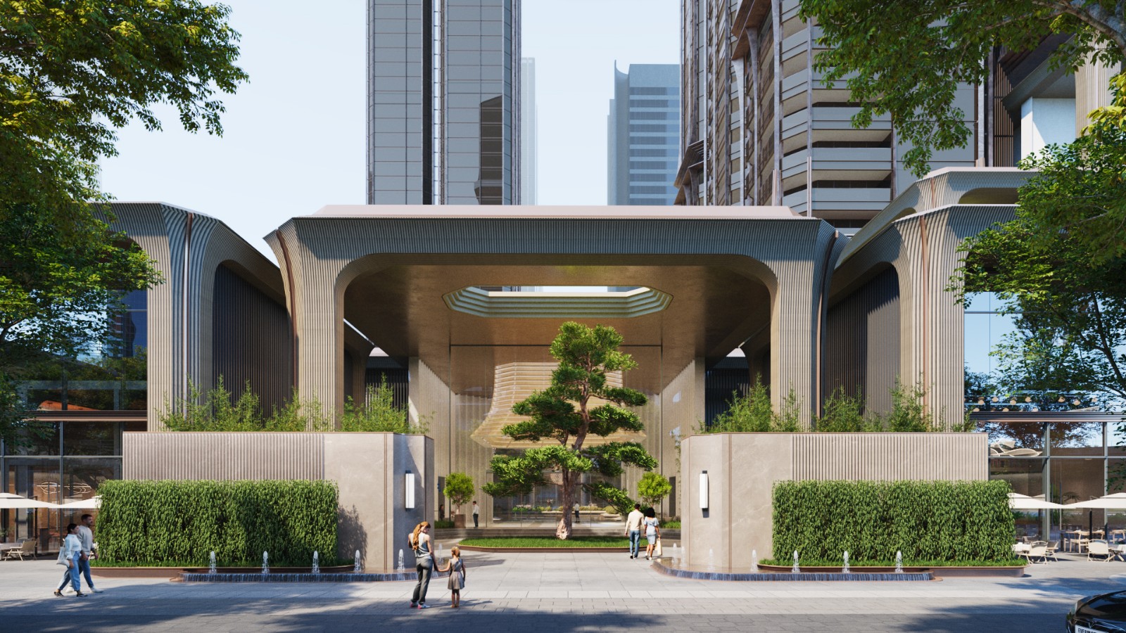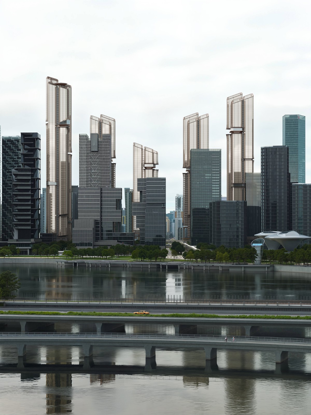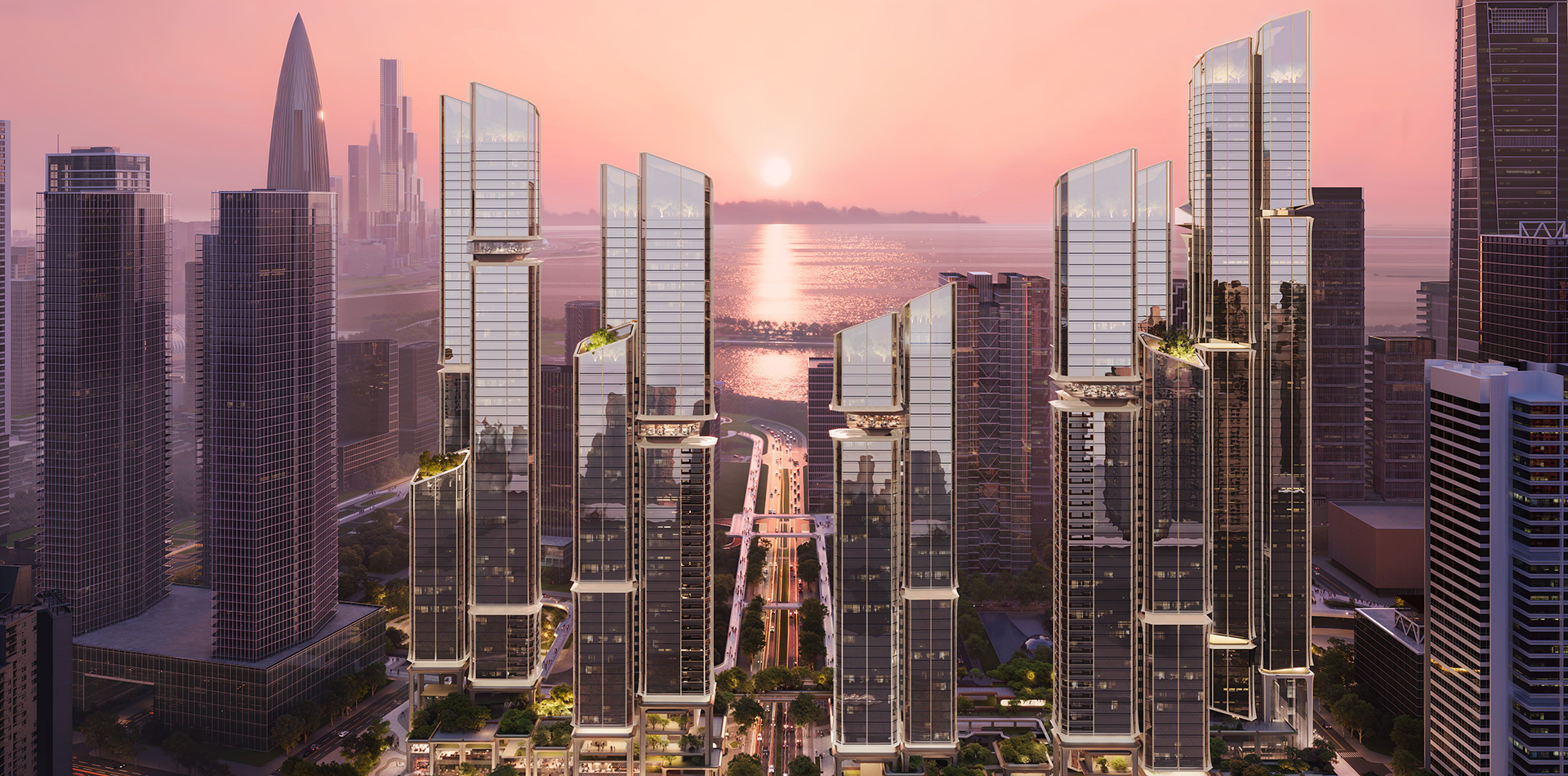 Five towers are arranged in a layered, staggered formation, their heights rising subtly at both ends and stepping down toward the center. This “double-peak” skyline introduces a dynamic silhouette, avoiding flatness while asserting a gateway presence in the city’s long view.