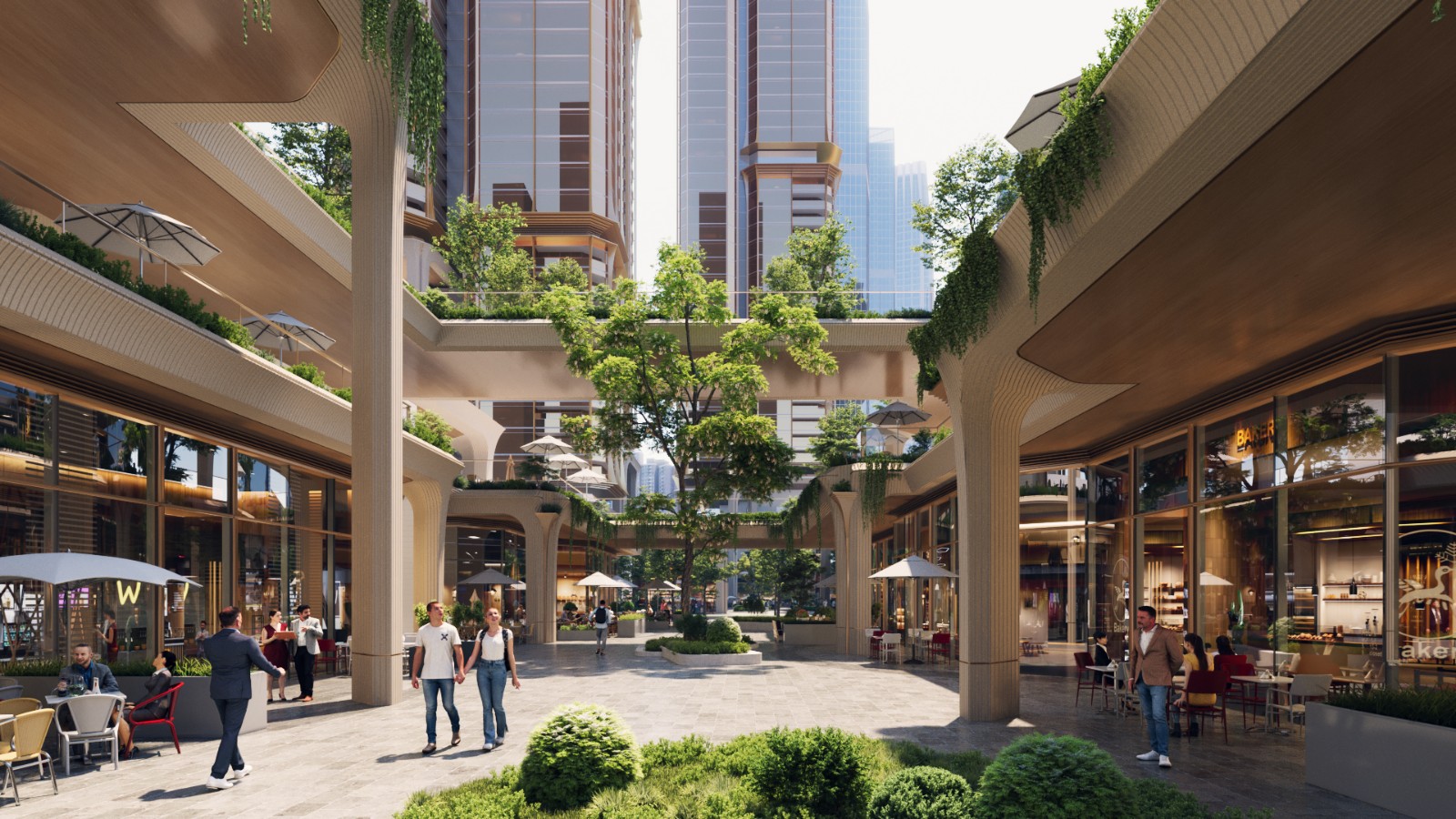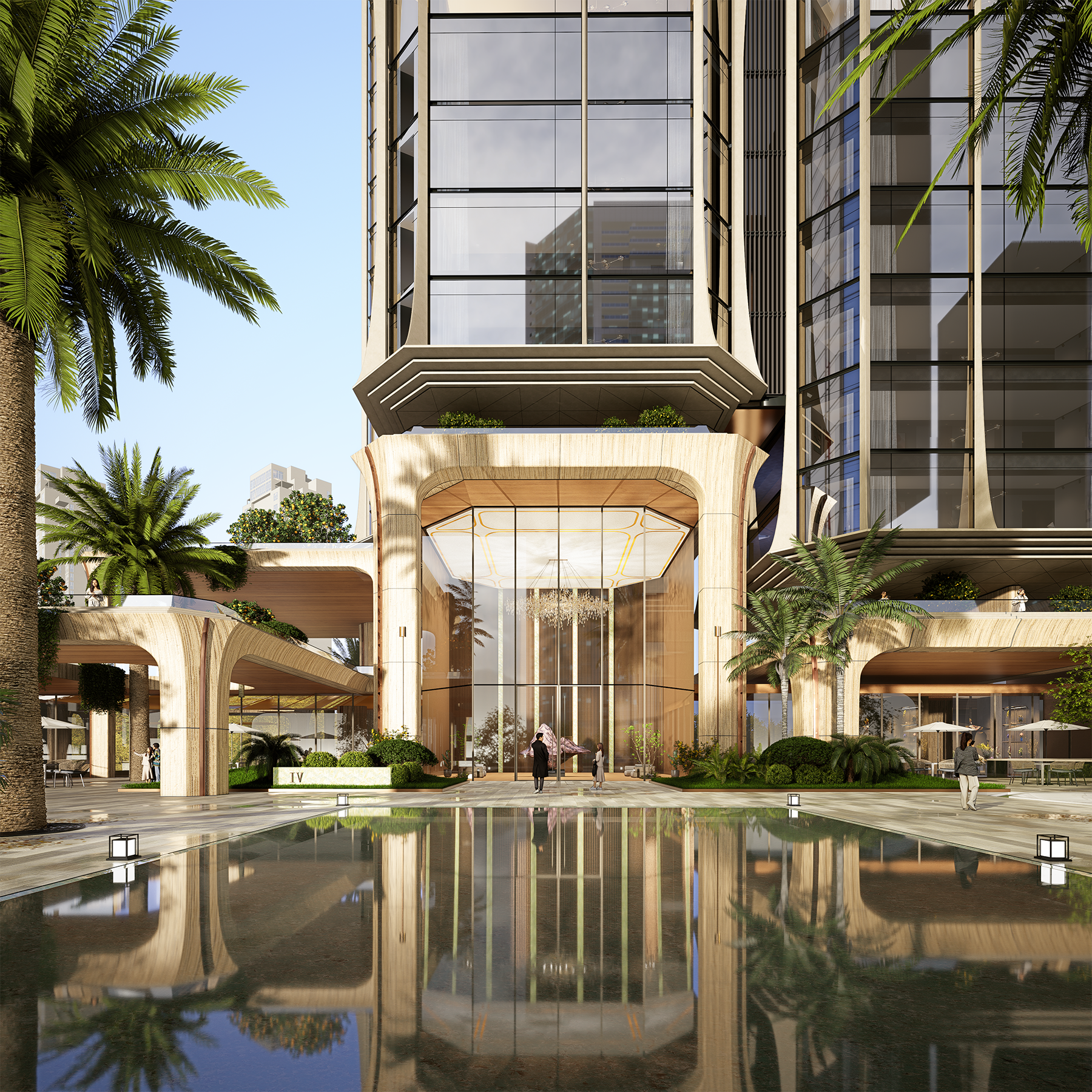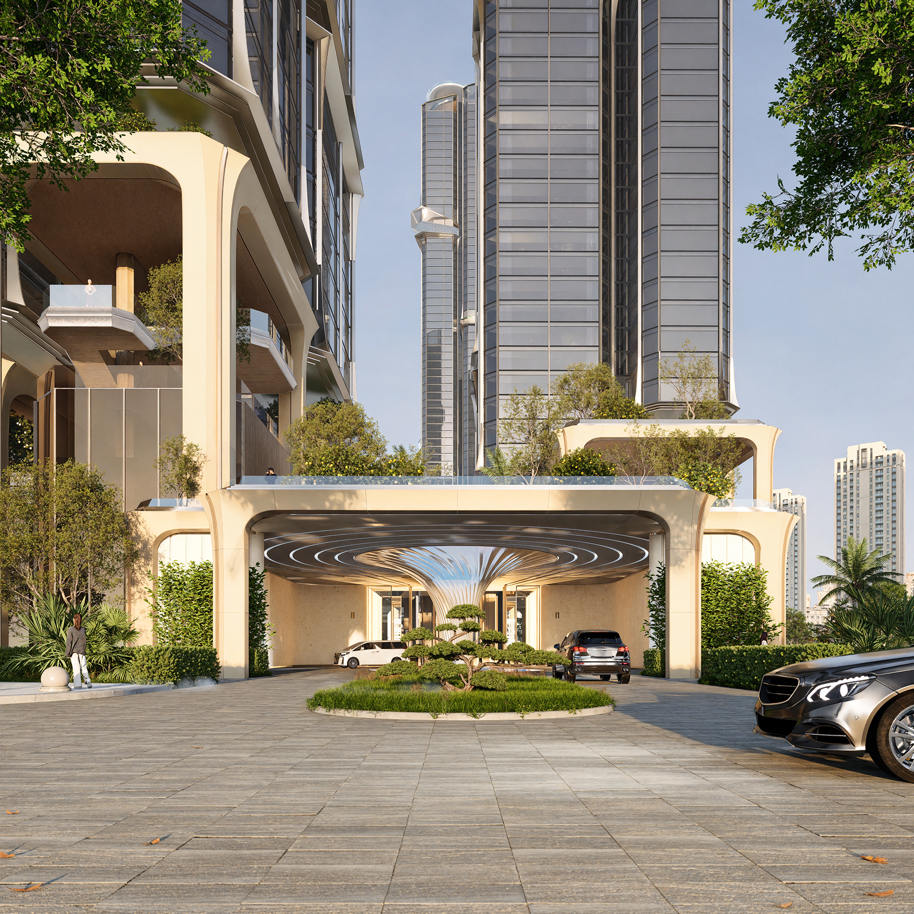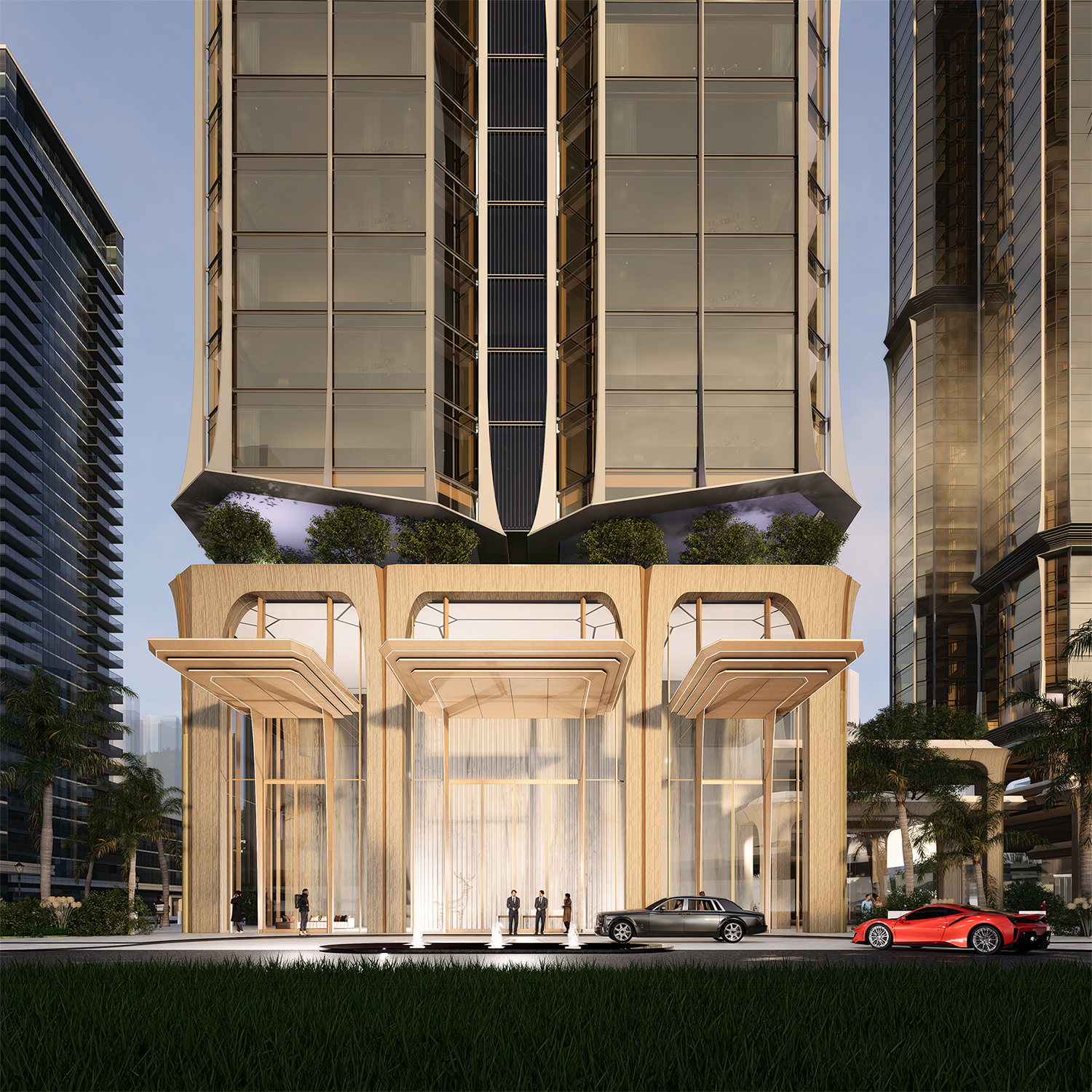 Five towers are arranged in a layered, staggered formation, their heights rising subtly at both ends and stepping down toward the center. This “double-peak” skyline introduces a dynamic silhouette, avoiding flatness while asserting a gateway presence in the city’s long view.
