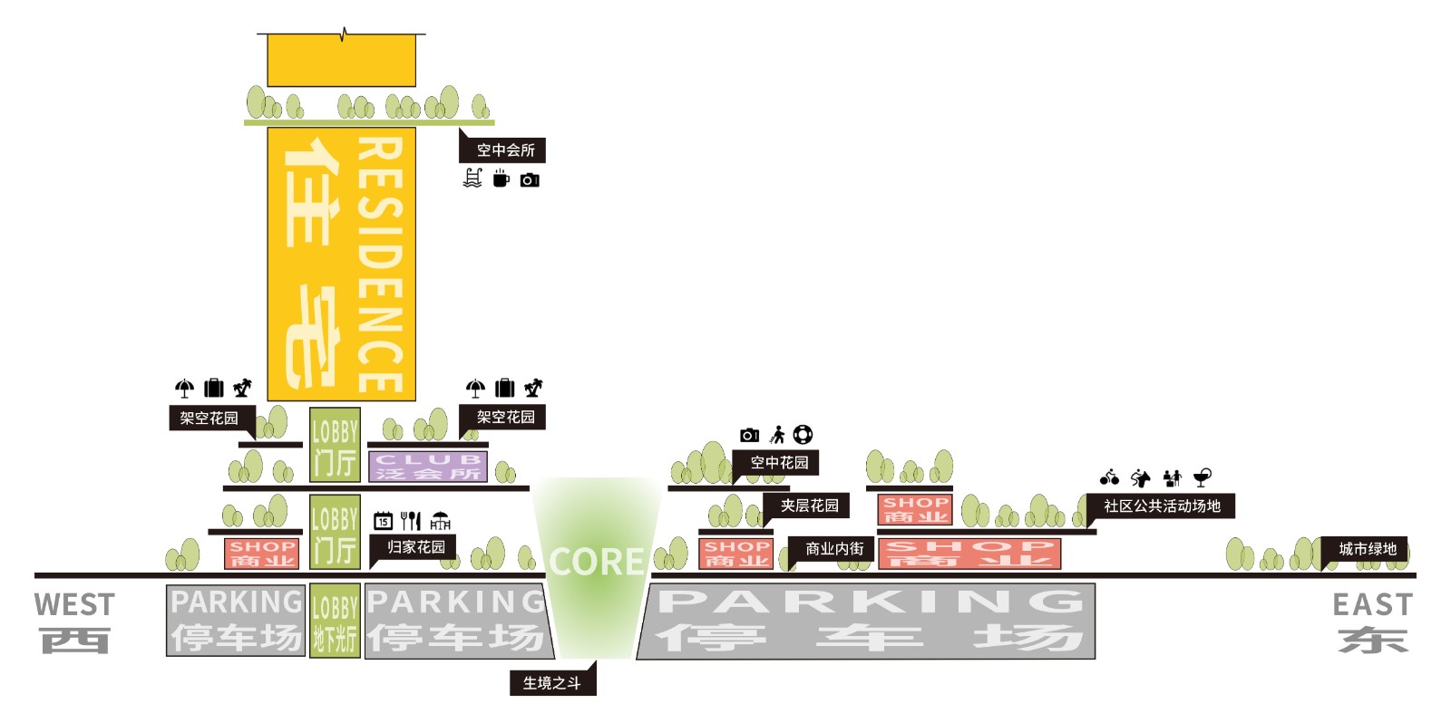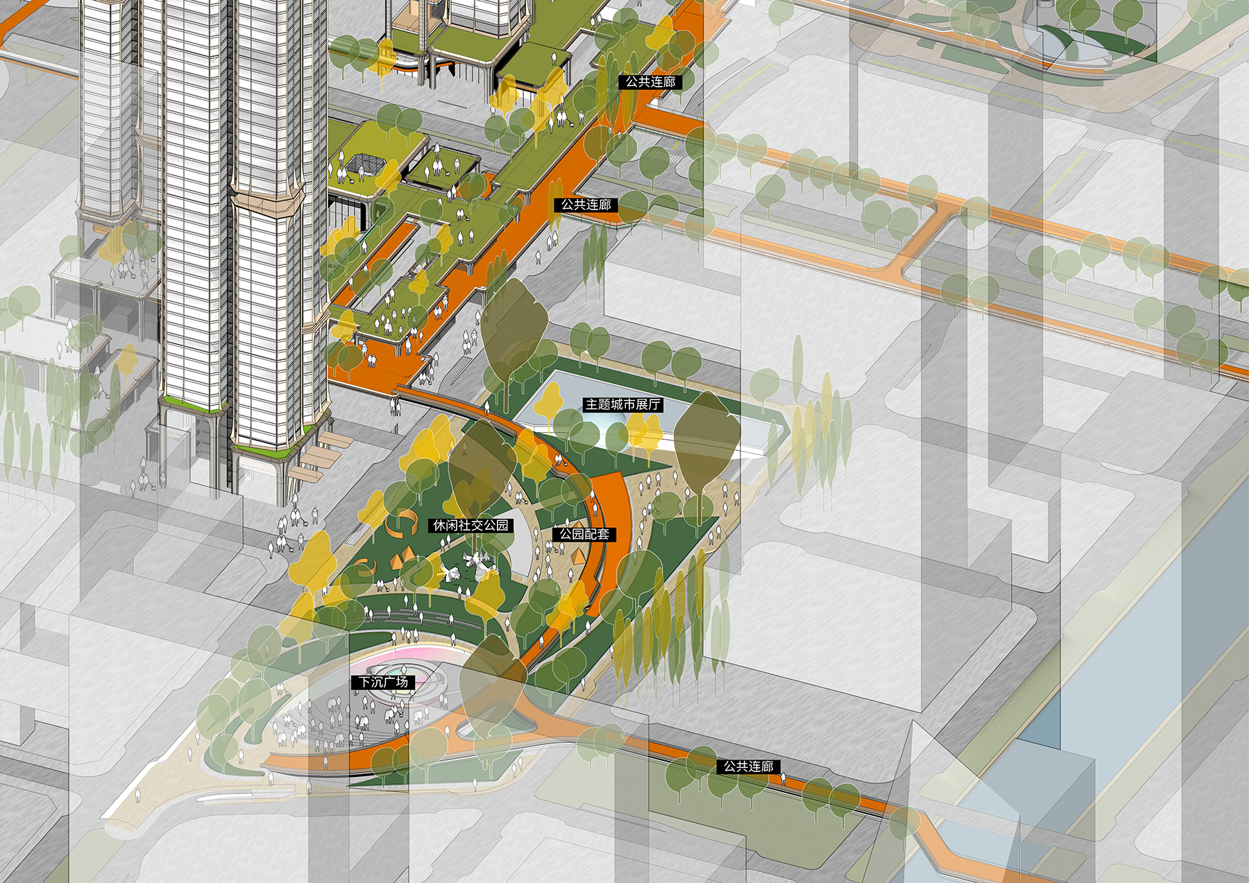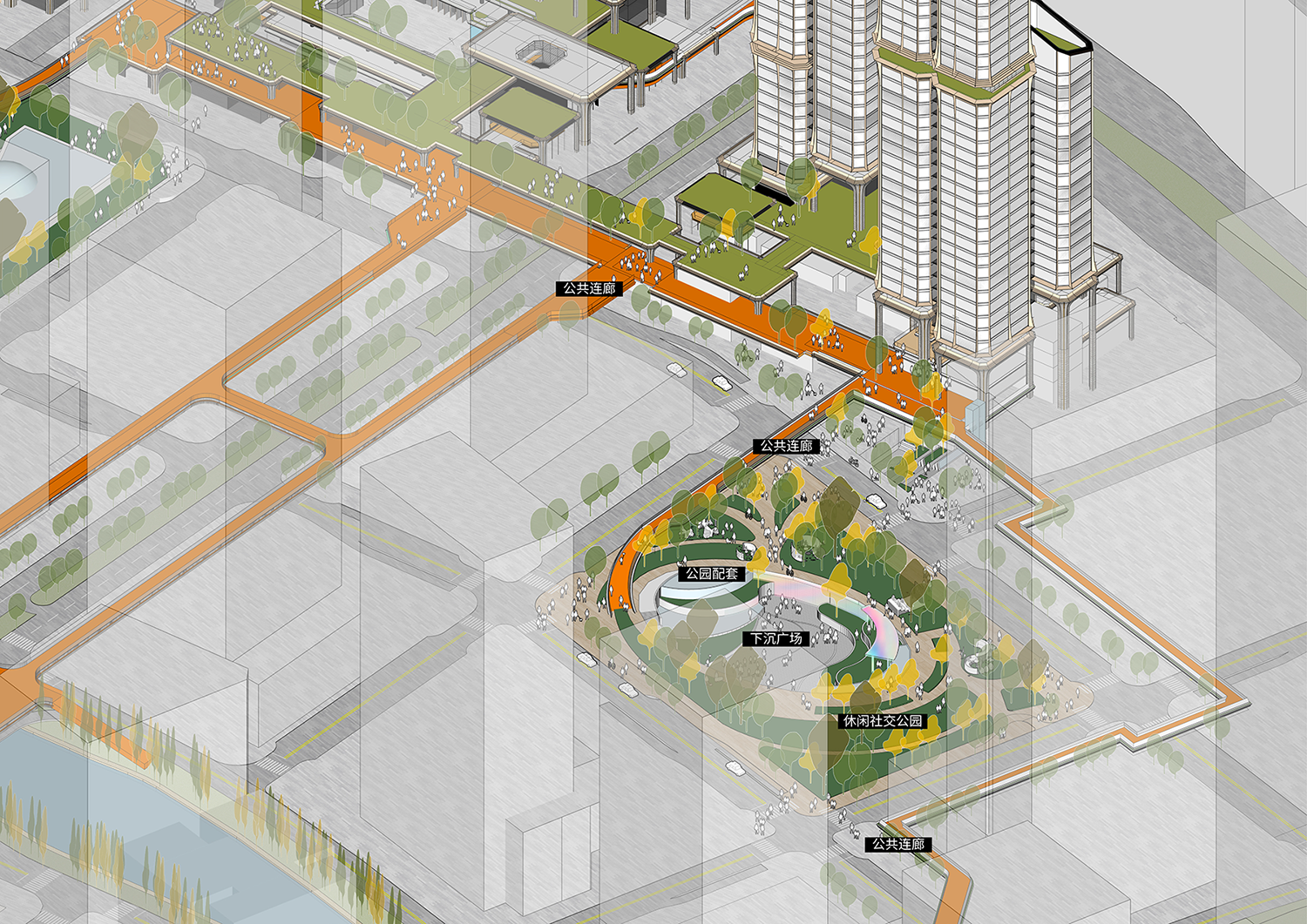Building on the existing skywalk system, the design extends public walkways northward to link a chain of pocket parks. By integrating ground, mezzanine, and subterranean circulation, it forms a four-dimensional spatial network that anchors the community within a broader public realm.