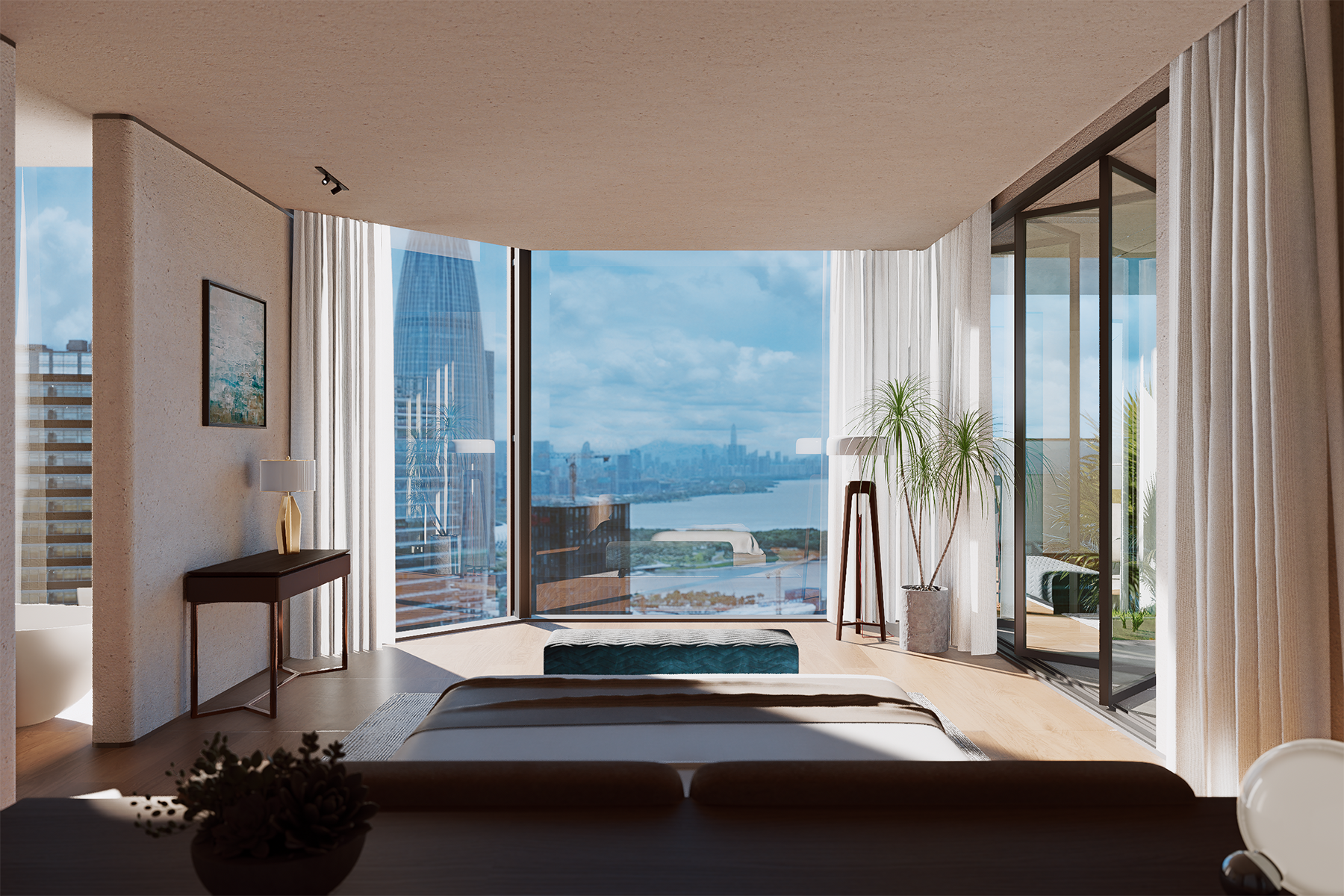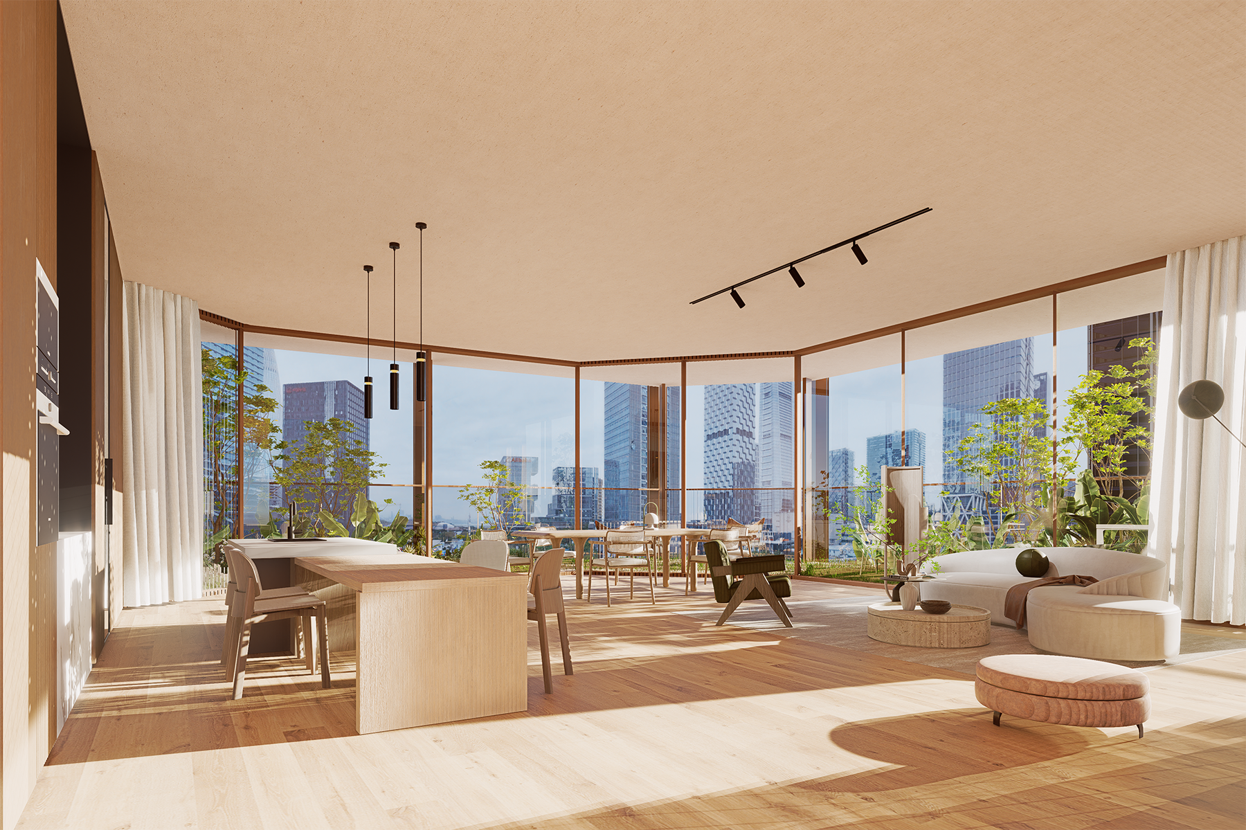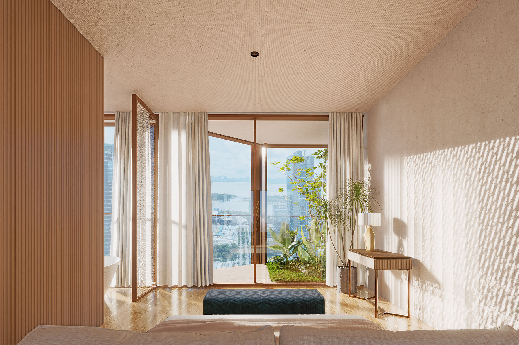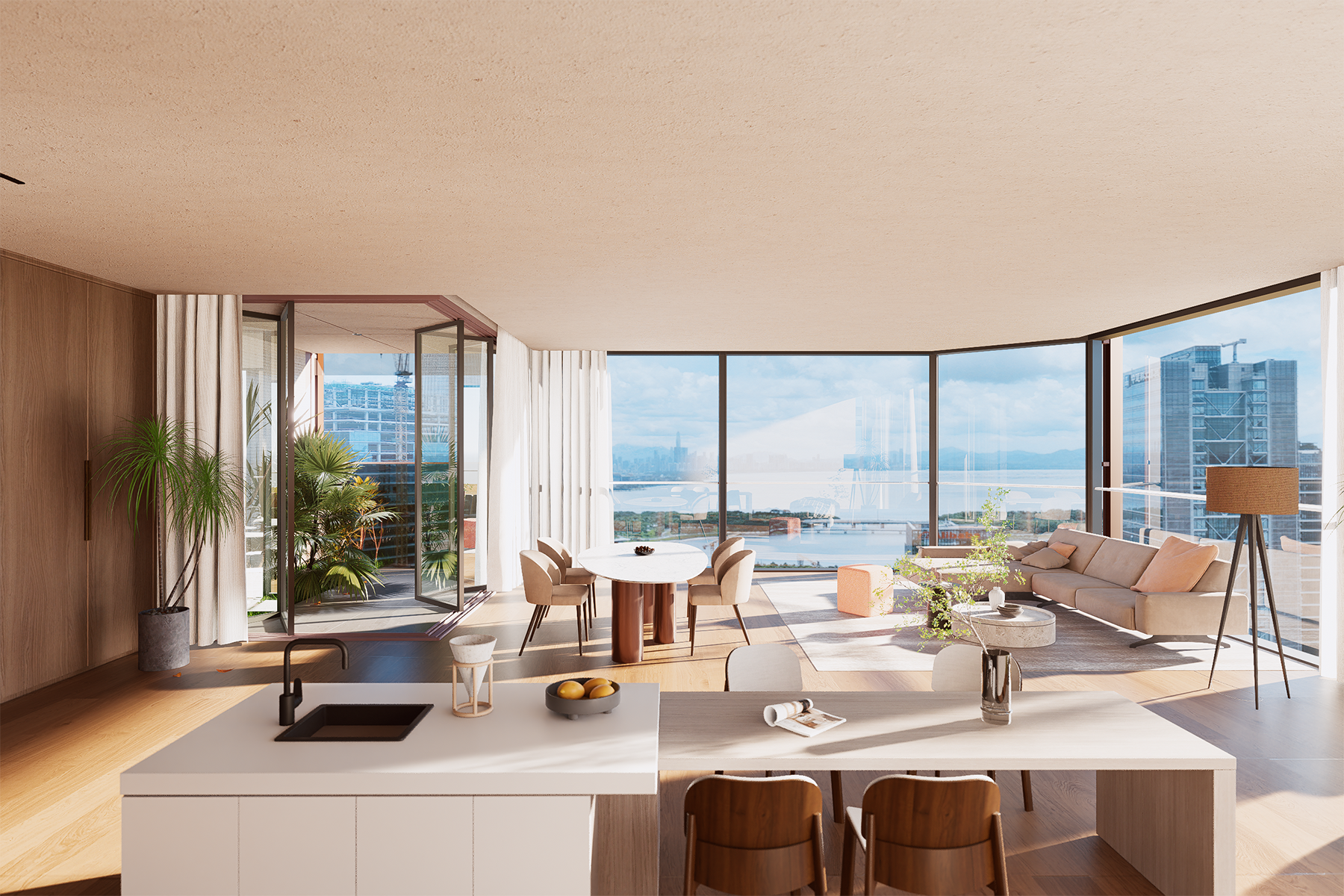 With its eastern edge facing Talent Park and the bay beyond, the project is designed to integrate the seascape into everyday living. To mitigate the common visual obstruction found in high-rise environments, simulations of sunlight, wind, and sightlines informed a fully east-oriented layout. Units are arranged to expand both horizontally and vertically, ensuring unobstructed ocean views for every residence.